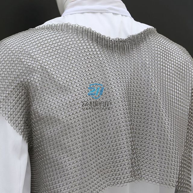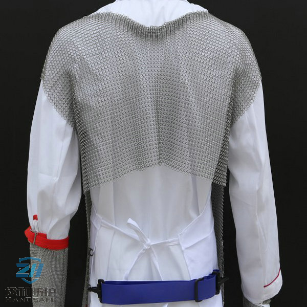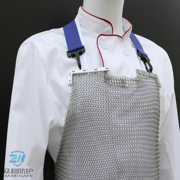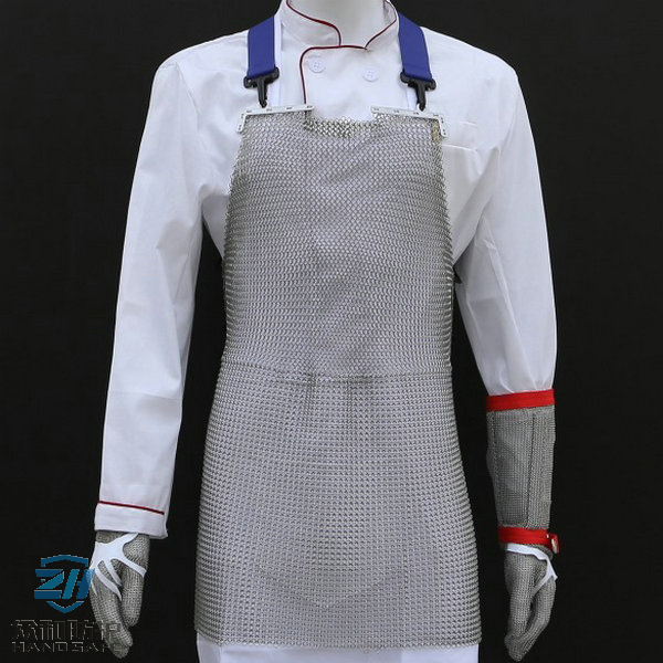 Stainless Steel Chainmail Mesh Apron-Knife Proof Butcher Apron with Adjustable Shoulder Strap were made from 100% new stainless steel wires 304 with the TPU or textile strap. It is extremely strong due to the high quality materials and perfect welding of each individural rings. So the chainmail mesh is comply with EN ISO 13998 standards and offer a 2 level protection.