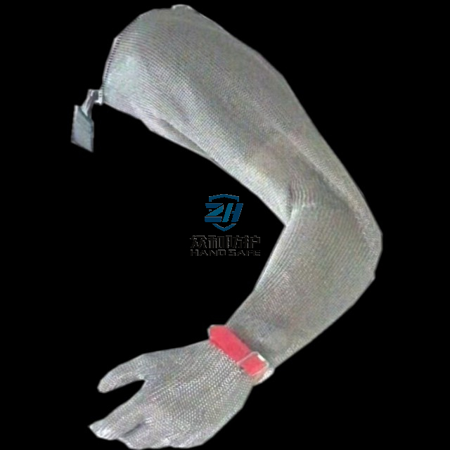 The Handsafe Stainless steel arm sleeve with full hand glove is ideal for applications of meat processing such as beef and pork cutting operations where cuts to the upper arms can occur. This full arm stainless steel sleeve is comfortable and ergonomic and has a lighter buckle to prevent the strap sliding, thus providing enhanced safety and there is no side opening so the wrist is fully protected.